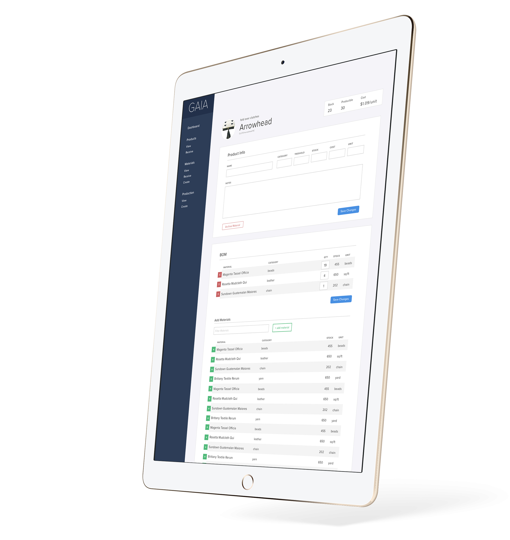 GAIA creates and sells their products both wholesale and retail. As their popularity grew, their confidence in meeting demand and maintaining materials' inventory at sustainable levels shrank. Our custom app provides GAIA with live data to inform their material and production orders.