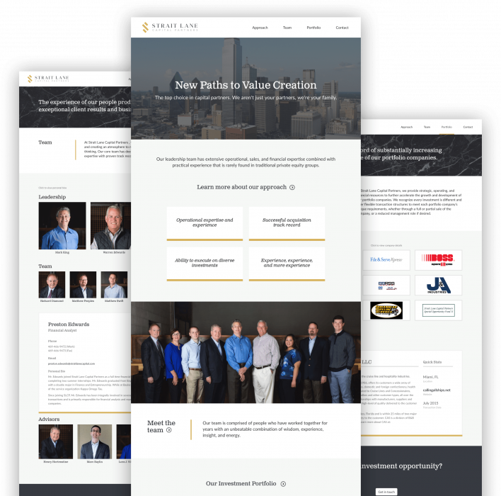 Most might think a private equity firm doesn't need a strong web presence, but the Strait Lane Capital team recoginzed that attracting the best investments meant putting their best foot forward. We worked with SLCP to refresh their brand mark along with the new website.